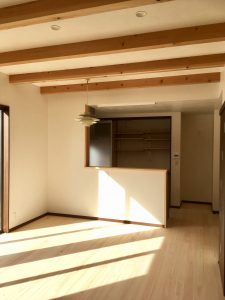 化粧梁現しのLDKです。壁・天井は珊瑚の塗壁